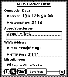 On the other end of things, Tracker Server is busy. People whowant a hyperlinked list of Newton servers are accessing it with theirWWW browsers while it is also constantly monitoring the status ofeach Newton that has registered with it. If a set period elapseswhere Tracker Server can't connect to your Newt and retrieve aspecial page (served by Tracker Client), it is removed from the listof active Newton servers. The ususal period for this expiration is 45minutes to one hour and a Newton is usually given 3 chances torespond before being removed.